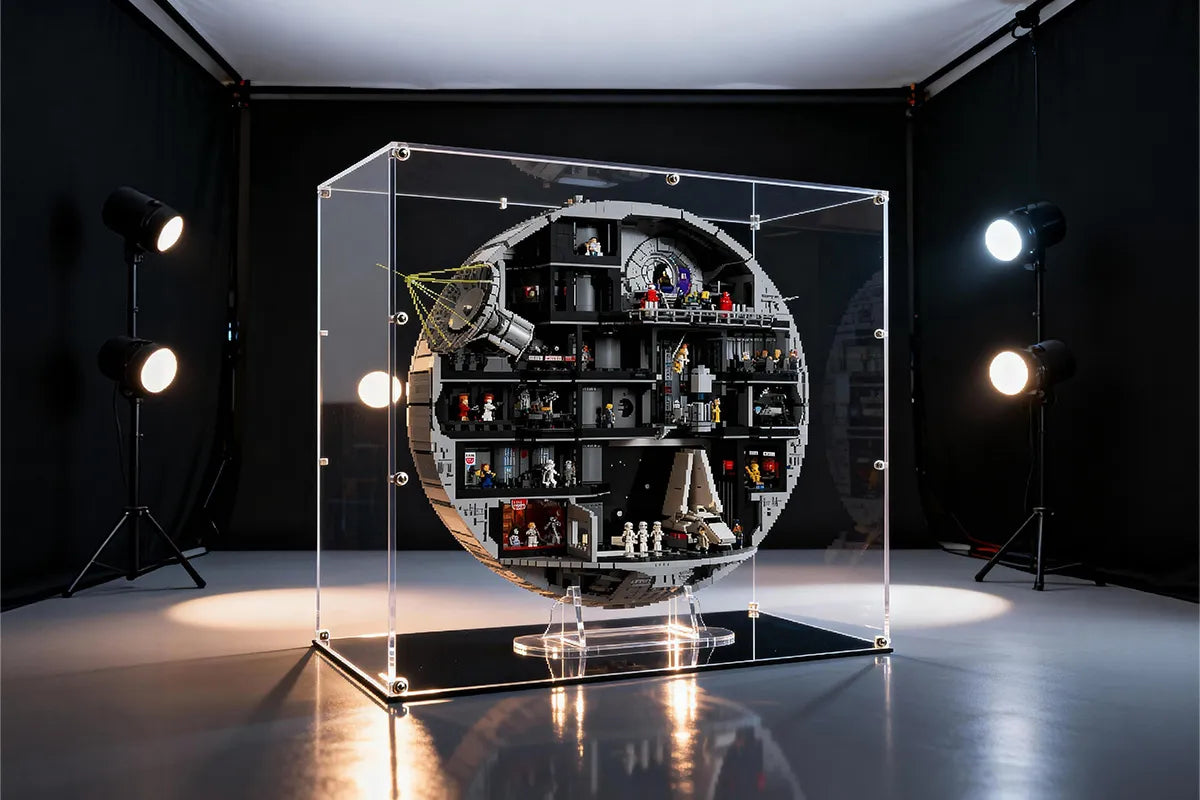Showcase your LEGO® The Little Mermaid Royal Clamshell (43225) with this 38 × 38 × 38 cm acrylic display case, built from premium crystal-clear acrylic panels that offer sturdy protection while keeping your model dust-free. Designed with a sleek black base for stability, the case provides a perfect fit for the Royal Clamshell set, allowing every colourful detail of Ariel’s undersea world to shine. Easy to assemble, durable, and stylish, it transforms your LEGO® creation into a stunning centrepiece for any desk, shelf, or cabinet—an essential for Disney fans and collectors alike who want to preserve and display their build in style.