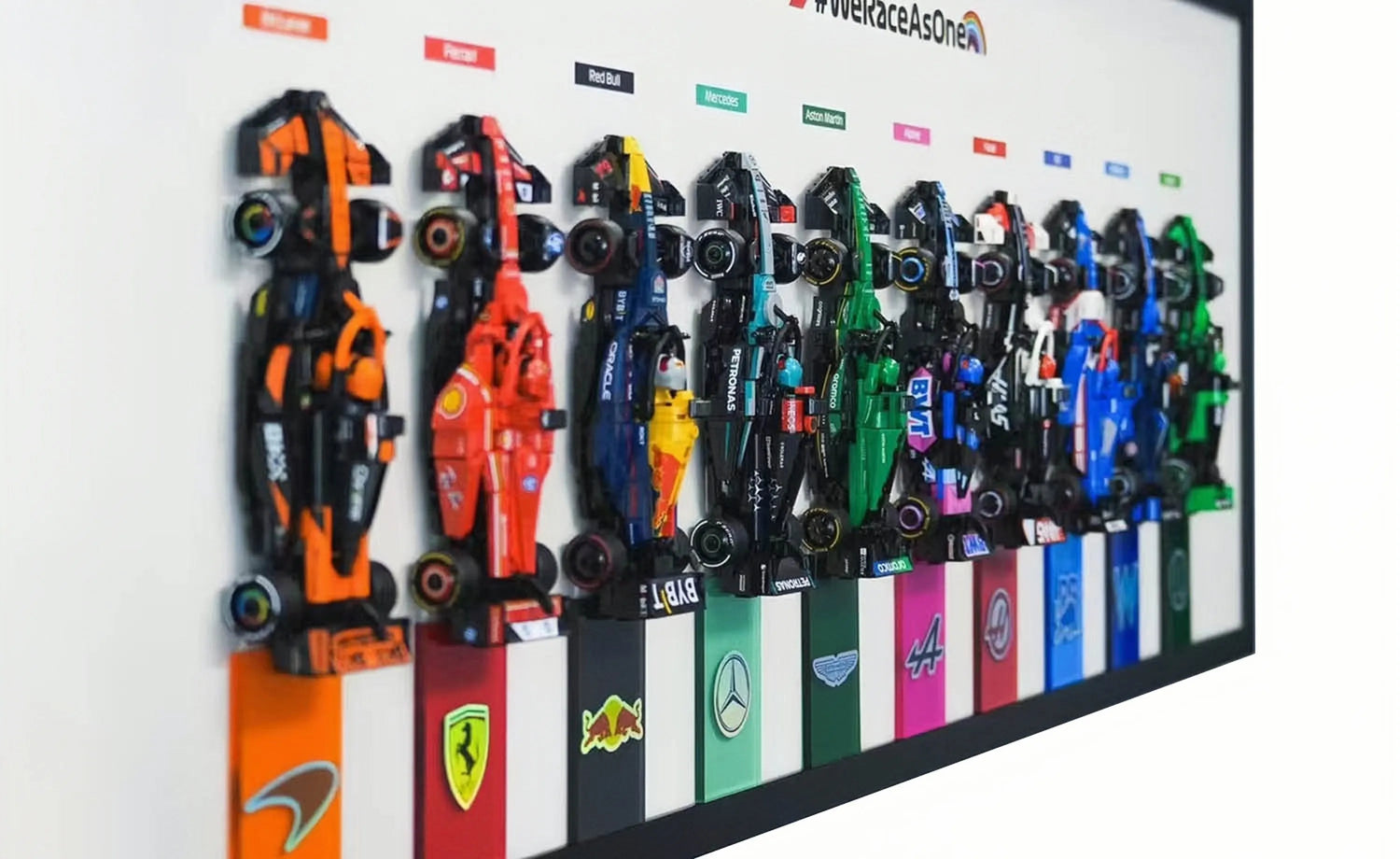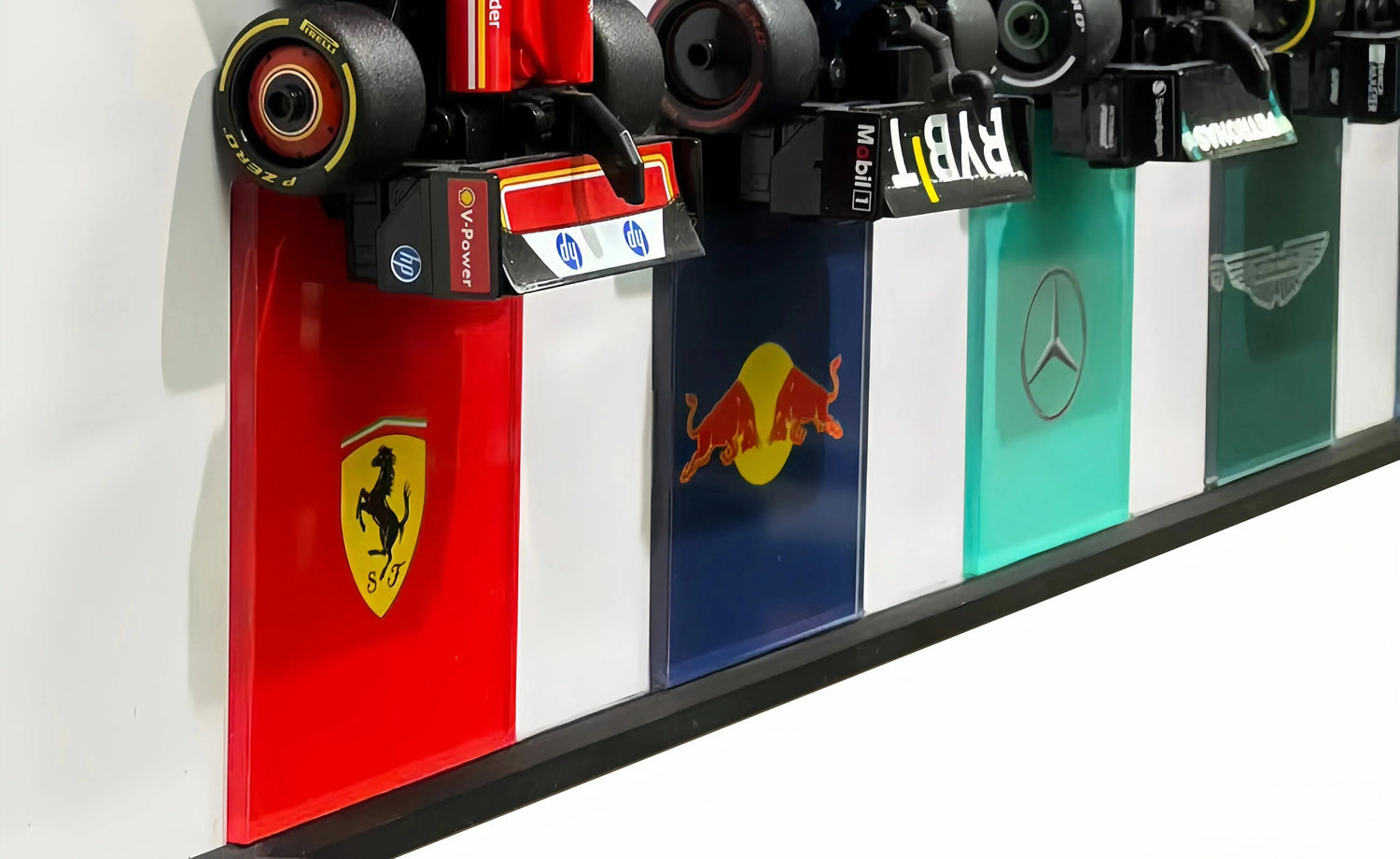Put your entire LEGO® Speed Champions F1 collection in pole position with this premium wall-mounted showcase, designed to hold 6 or 10 Formula 1™ cars in a sleek, unified frame. Featuring a bold grid-inspired printed backdrop with team logos and colour zones, individual slots for each car, and 20 LEGO® bricks for secure mounting, it’s compatible with Ferrari, Red Bull, McLaren, Mercedes, and more. Available in multiple sizes (10 cars – 120×45 cm or 70×80 cm; 6 cars – 100×50 cm), this display mounts seamlessly for a floating gallery effect, keeping your models in championship order.