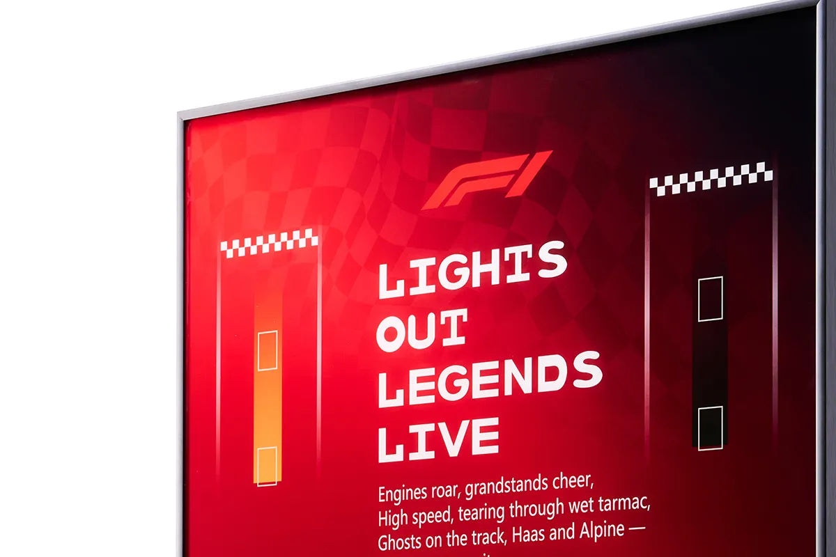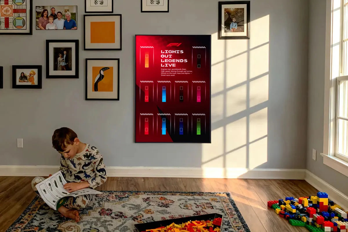 Fuel your passion for racing and brick-building with this premium wall display frame for the LEGO® Speed Champions F1 Series, designed to hold up to 10 standard-sized LEGO® F1 cars in a secure, championship-style grid. Featuring a vivid red racing-inspired backdrop with “Lights Out, Legends Live” graphics, it brings authentic motorsport energy to your collection. Available in a standard version or with optional USB-powered LED lighting for extra podium-worthy impact, the frame is crafted from durable MDF with a high-resolution printed background and comes ready to hang with included mounting hardware and 20 LEGO® bricks for installation.