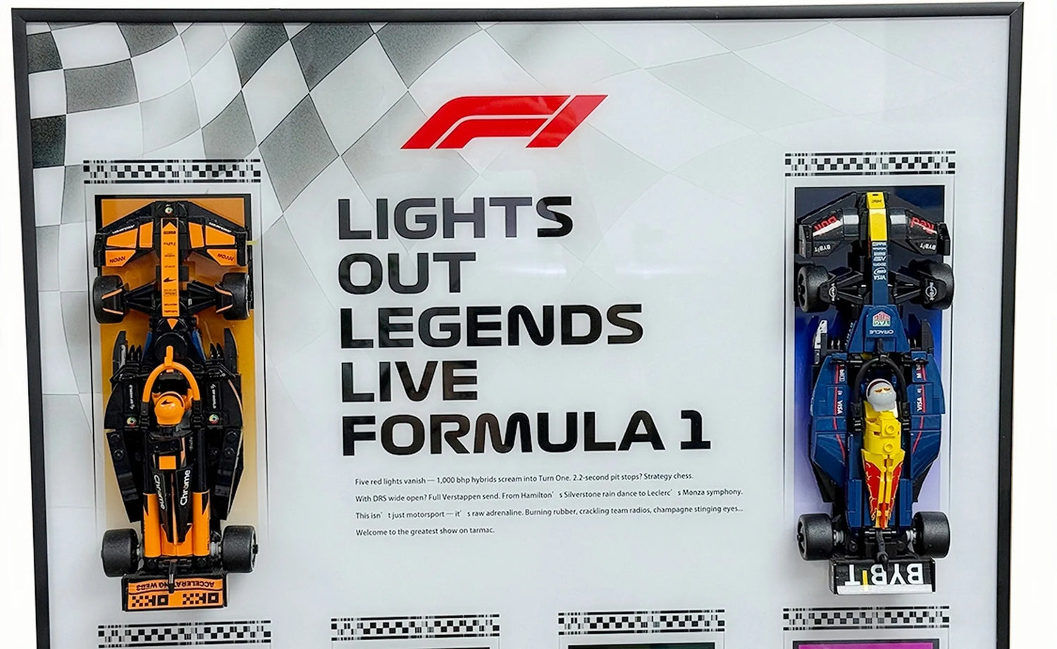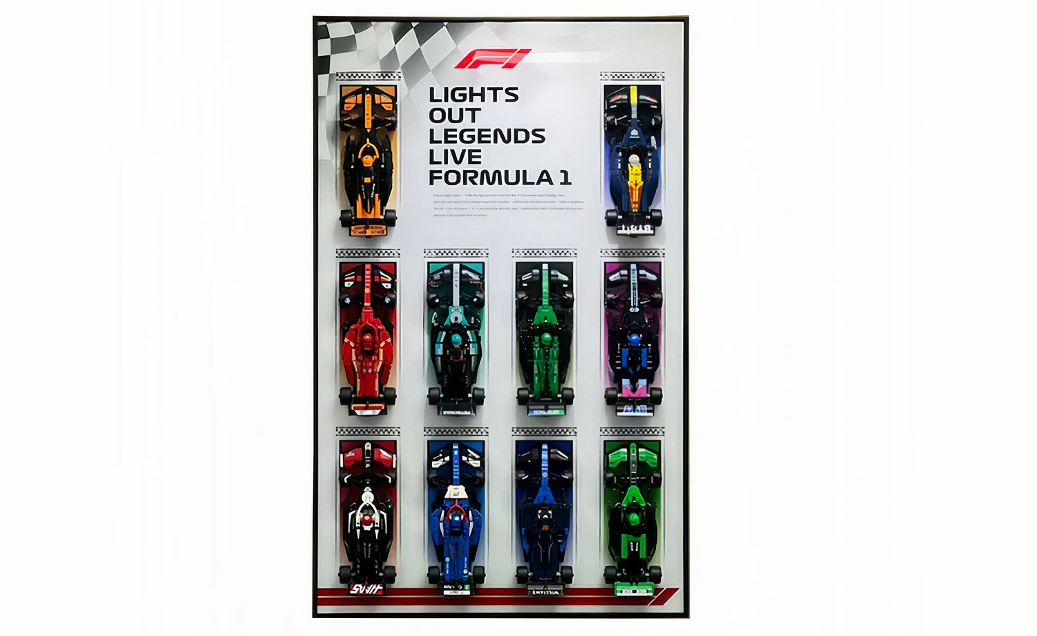 Show off your full Formula racing grid with this LEGO® Speed Champions F1 display frame, built to hold 10 team cars in one striking line-up. Each slot uses two genuine LEGO® bricks for secure, hook-free mounting, with vibrant printed backdrops for teams like Red Bull, Ferrari, Mercedes, Aston Martin, and McLaren, plus a bold chequered header. Measuring 80 × 50 cm and with an optional USB-powered LED upgrade (no plug included), it’s the ultimate wall display for any F1 fan.