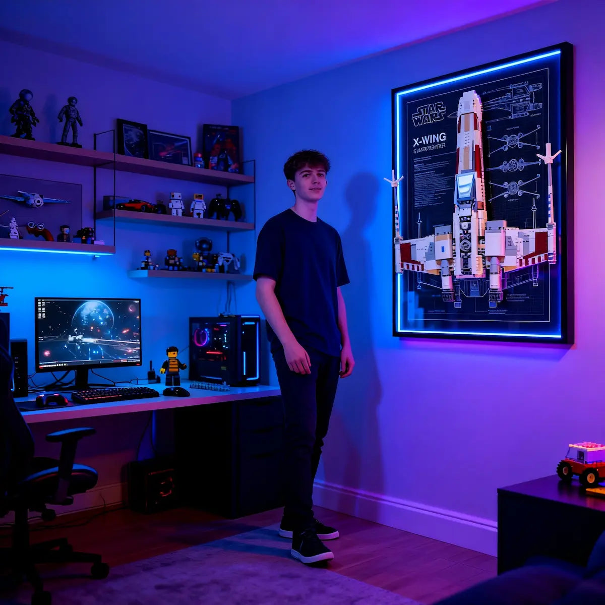 Neon-lit LEGO display energizes game rooms with futuristic cyberpunk vibes and bold lighting.