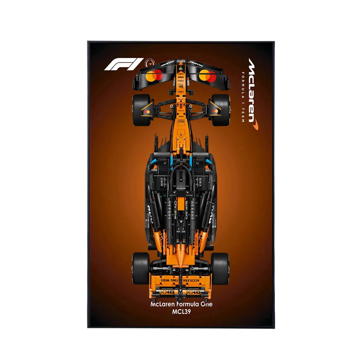 The frame combines a UV-printed acrylic front panel with a rigid PVC foam (Foamex) backing board, delivering sharp colour reproduction and reliable structural support. This construction helps reduce warping and moisture damage, making it suitable for typical UK home environments. The striking McLaren papaya colour scheme and Formula 1 graphics highlight the technical details of the MCL39 build while keeping the focus on the car itself.
