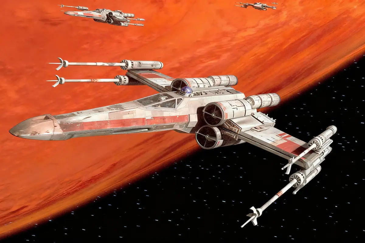 The bold, high-contrast sci-fi background complements the iconic silhouette of the USS Enterprise, creating a sense of motion and scale. When mounted, the model appears to be travelling at warp speed, bringing Starfleet engineering to life.