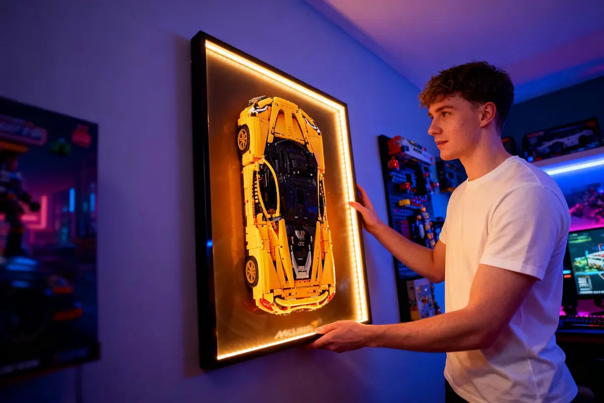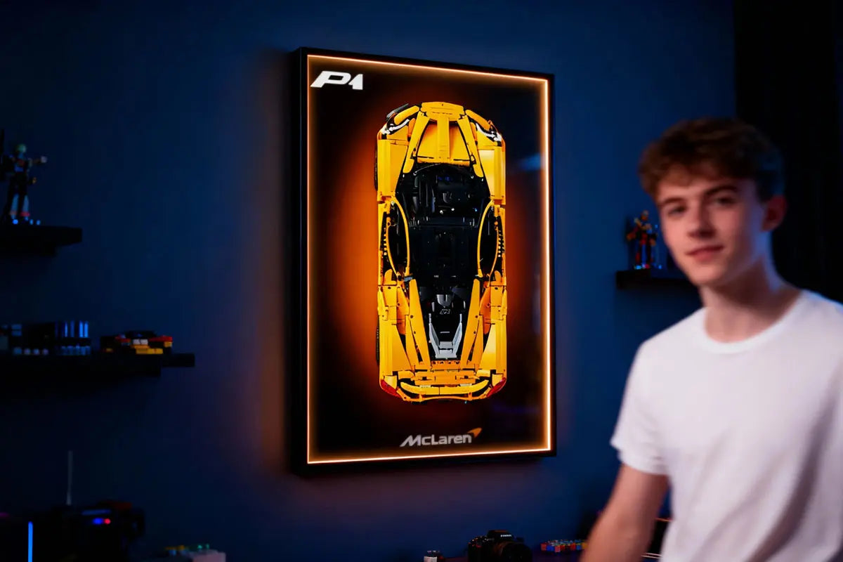 This premium wall-mounted display frame is custom-designed for the LEGO® Technic™ McLaren P1 (42172), featuring a bold orange-to-black gradient backdrop with subtle McLaren branding that captures the essence of the hybrid hypercar. Crafted from lightweight aluminium alloy and printed with eco-friendly UV inks, it offers both sustainability and style. Optional USB-powered LED lighting adds a soft ambient glow, while concealed rear hooks create a clean floating effect. Measuring 80 × 50 cm, it includes the frame, wall mounting kit, and LED strip (LED version only).